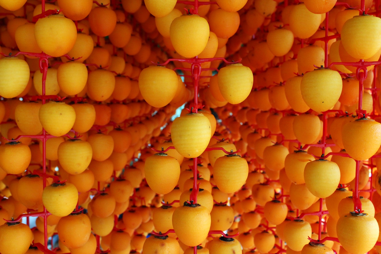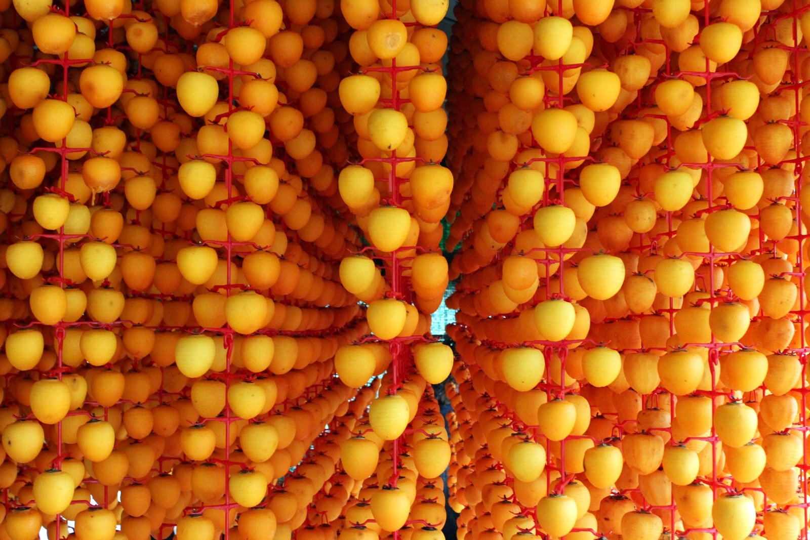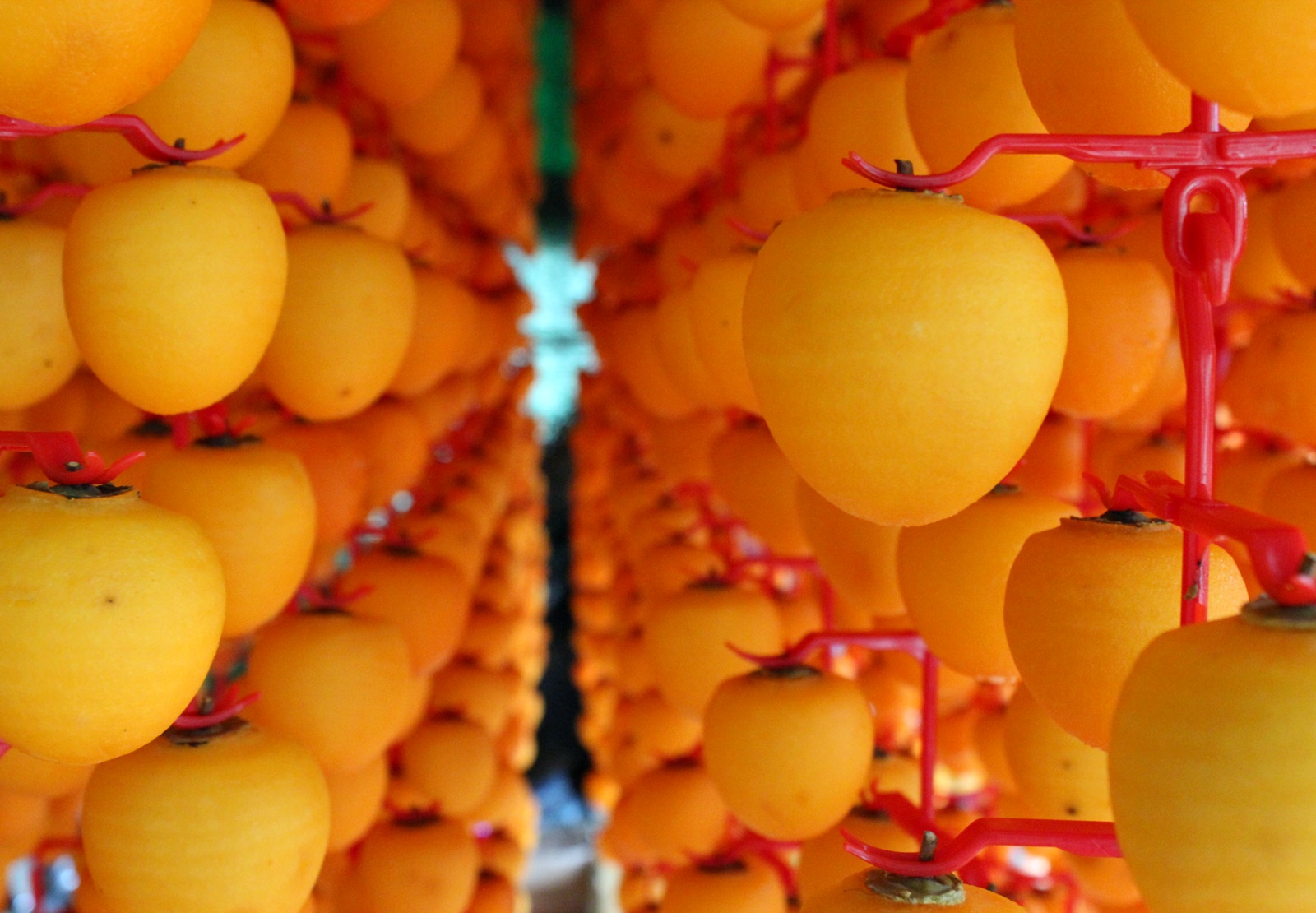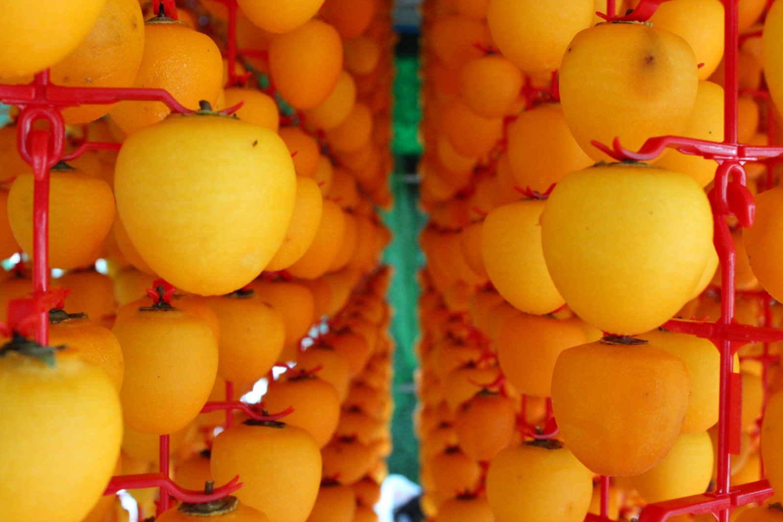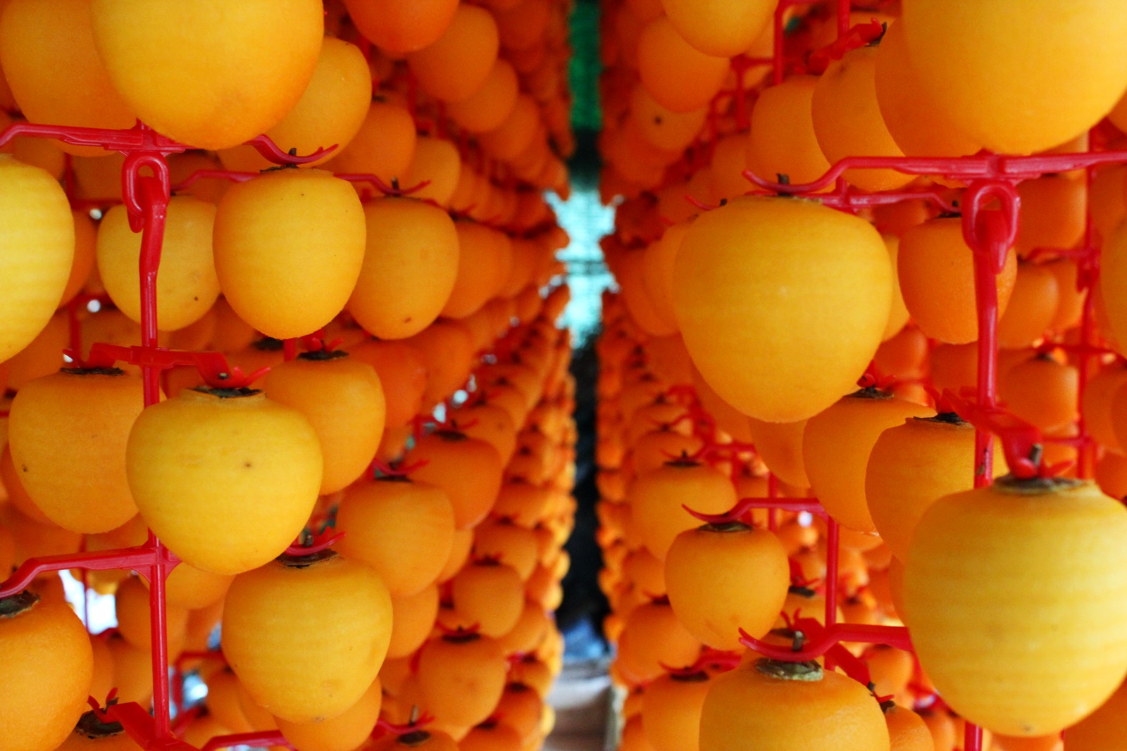 수시감은 대봉감과 비슷하게 생겼지만 대봉감보다 작은 감으로 상강이 지나면 수시라는 품종의 감을 수확하여 꽃받침 부분과 껍질을 깎아 꼭지부분을 감 고리에 끼워 덕장에 걸어 말립니다.