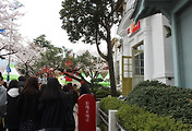 진해제과를 나와 유리창에 붙어 있는 벚꽃이 들어 간 상품 안내를 찍는데 도로의 벚꽃이 진해제과 안에 가득 피었습니다. 벚꽃이 피는 이 계절에나 볼 수 있는 풍경입니다.