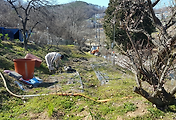 혼자 여러 종류의 바람개비를 만들어 설치해 두었습니다. 재활용입니다. 맞은편의 산에 핀 하얀꽃은 벚꽃입니다.