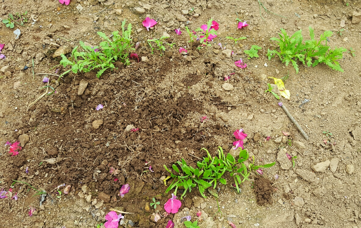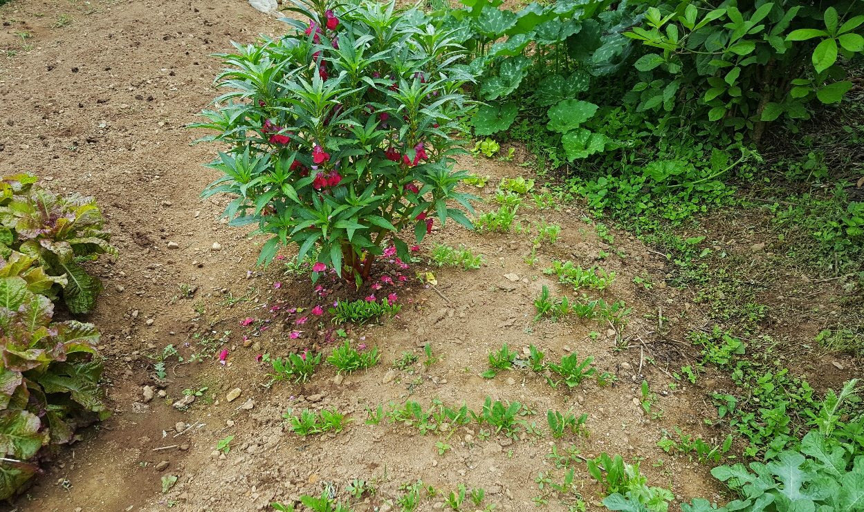 참깨를 옮겨 심으려니 옆의 큰 봉숭아가 자꾸 걸렸습니다. 그곳에는 시금치, 상추 등이 발아하여 자라고 있거든요.
