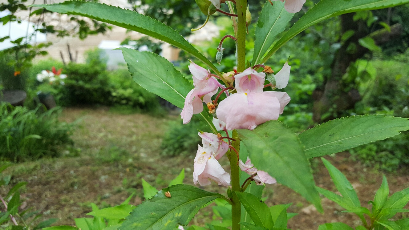 봉숭아는 무궁화처럼 여러 달 새꽃을 피우는데 일찍 핀 꽃은 씨앗을 품었습니다.