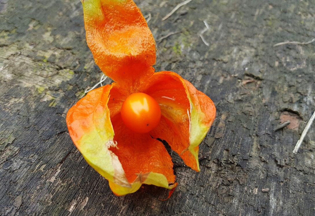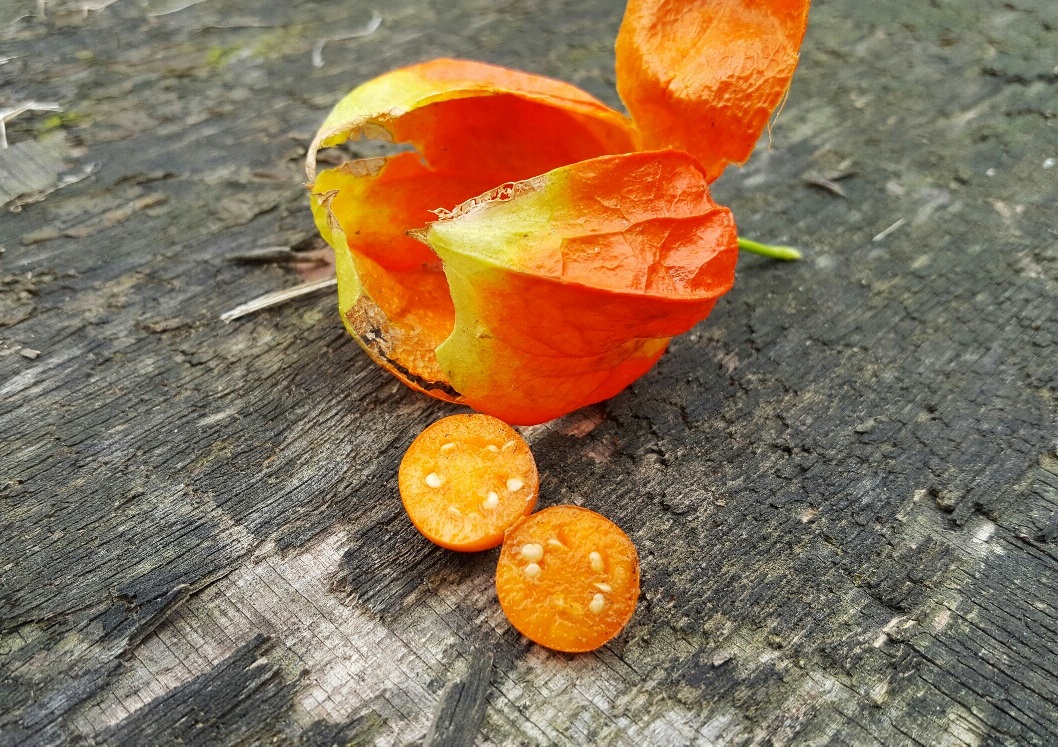 풍선 같은 주머니를 뜯으니 동그란 열매가 배꼽을 드러내고 있었습니다. 기왕 땄으니 열매 속을 보고 싶어 잘랐습니다. 주머니와 같은 색의 붉은 열매는 주황색 살에 하얀 씨앗이 박혀 있었습니다. 여기까지만 했습니다.