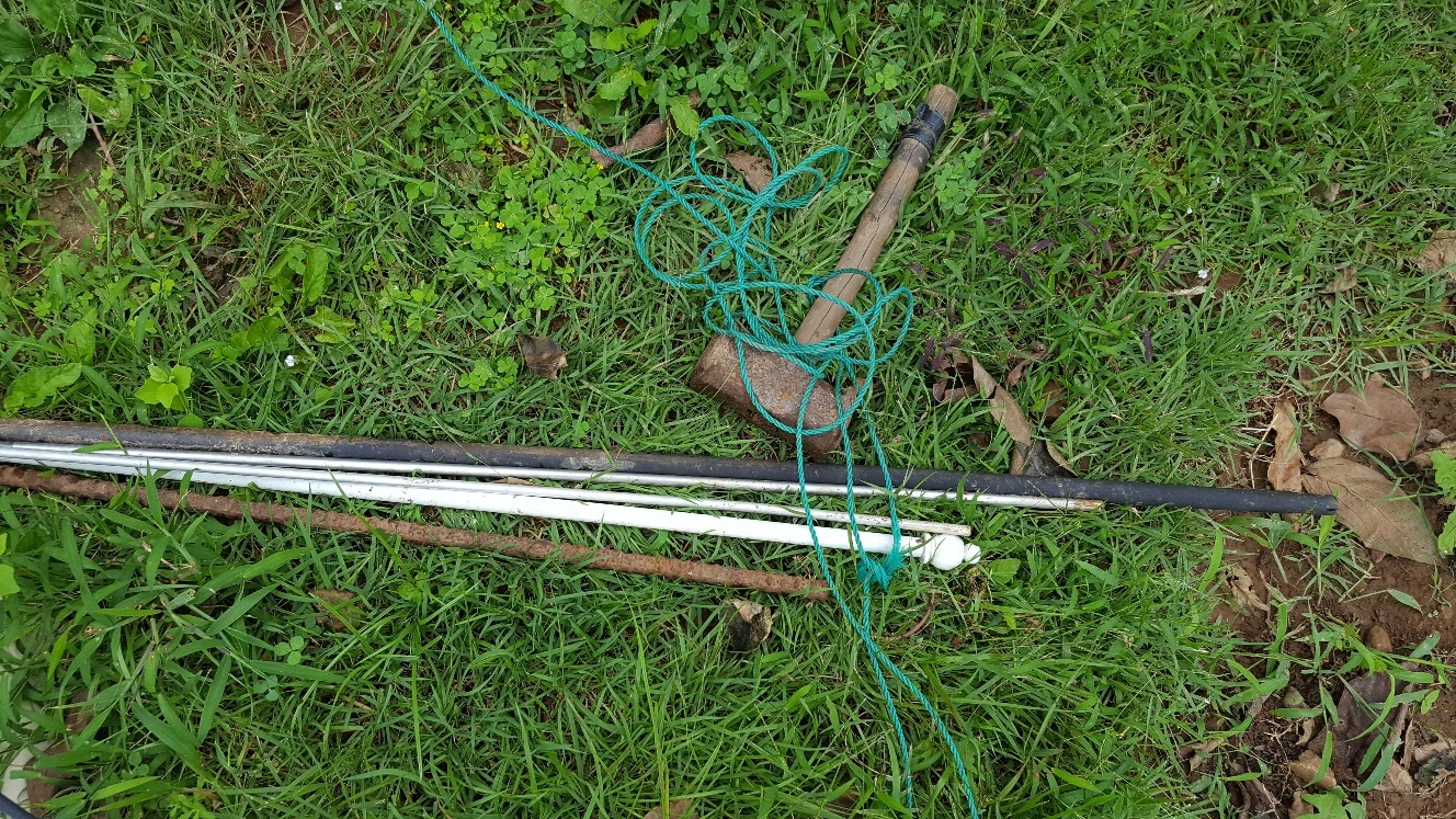 꽈리를 세워 묶어주기 위해 최선을 다하여 준비한 도구들입니다. 망치가 무겁기에 웬만해서는 망치를 꺼내지 않고 호미자루로 지지대 등을 박는데 꽈리를 세우기 위해서는 망치가 있어야 할 것 같았습니다. 그 많던 고추 지지대가 보이지 않아 철재로 된 막대기를 텃밭을 돌아다니며 모았습니다.