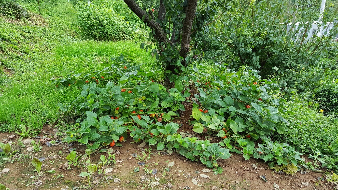 뒷쪽에는 정구지가 있기에 굳이 세우지 않아도 되지만 하는 김에 다 세우기로 하고 넘어진 꽈리를 일으키려는데 뱀이 나타났습니다. 정확하게는 나타난 게 아니라 잠을 자거나 쉬고 있는 뱀을 깨운 거지요. 보통 뱀은 빠르게 앞으로 나아가는데 이 뱀은 느렸습니다. 잠을 깨운 제 잘못이었습니다. 발로 땅을 탁탁 치니 꽈리 사이로 스르르 사라졌습니다.