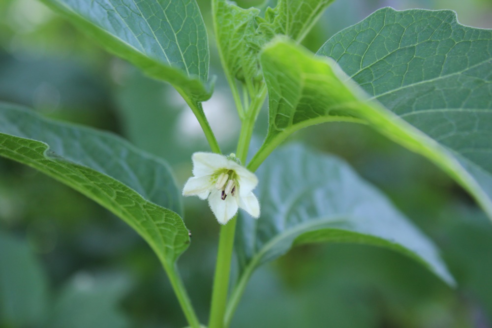 꽈리를 처음 심은 곳은 계단 중간쯤에 있는 감나무 아래였습니다. 꽃은 5 ~ 8월에 하얀색으로 핍니다. 꽃받침은 짧은 종 모양으로 길이 1cm쯤이며, 5갈래로 갈라지며 화관도 5갈래로 갈라집니다. 수술은 5개, 암술은 1개입니다.