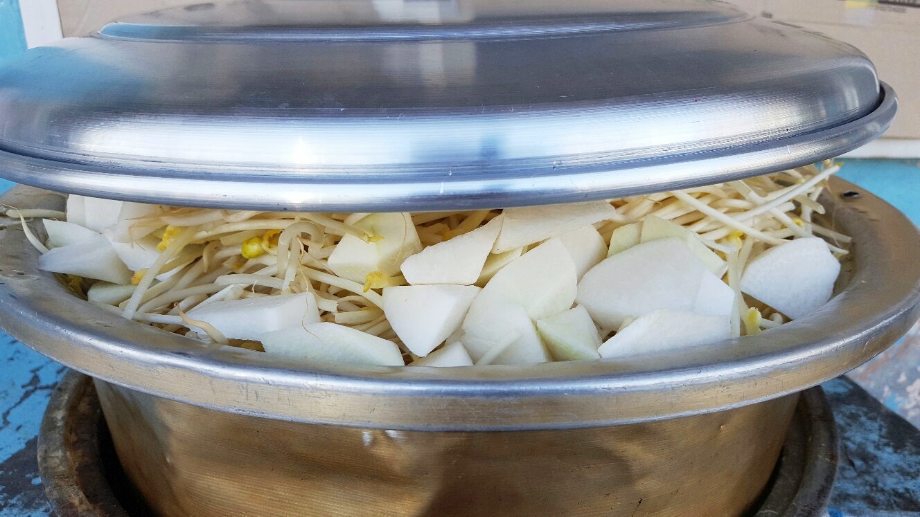 계산을 하고 나오는데 밖에서 콩나물과 무를 큰솥에 삶고 있었습니다. 아삭한 그 콩나물입니다.