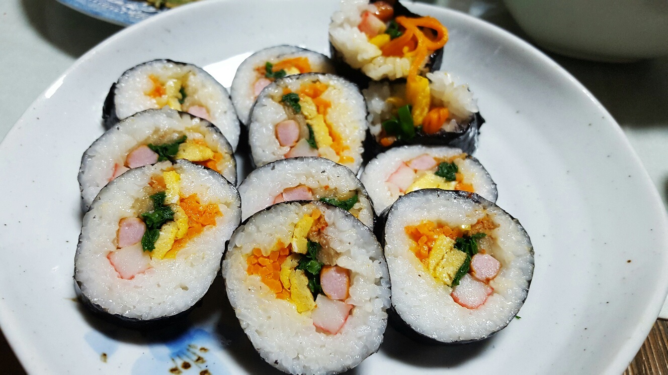 첫물정구지를 캤으니 바지락을 넣어 지짐을 굽고, 정구지를 데쳐 무치고 김장김치의 양념을 털어낸 후 김밥을 쌌습니다. 국은 바지락 쑥국입니다.