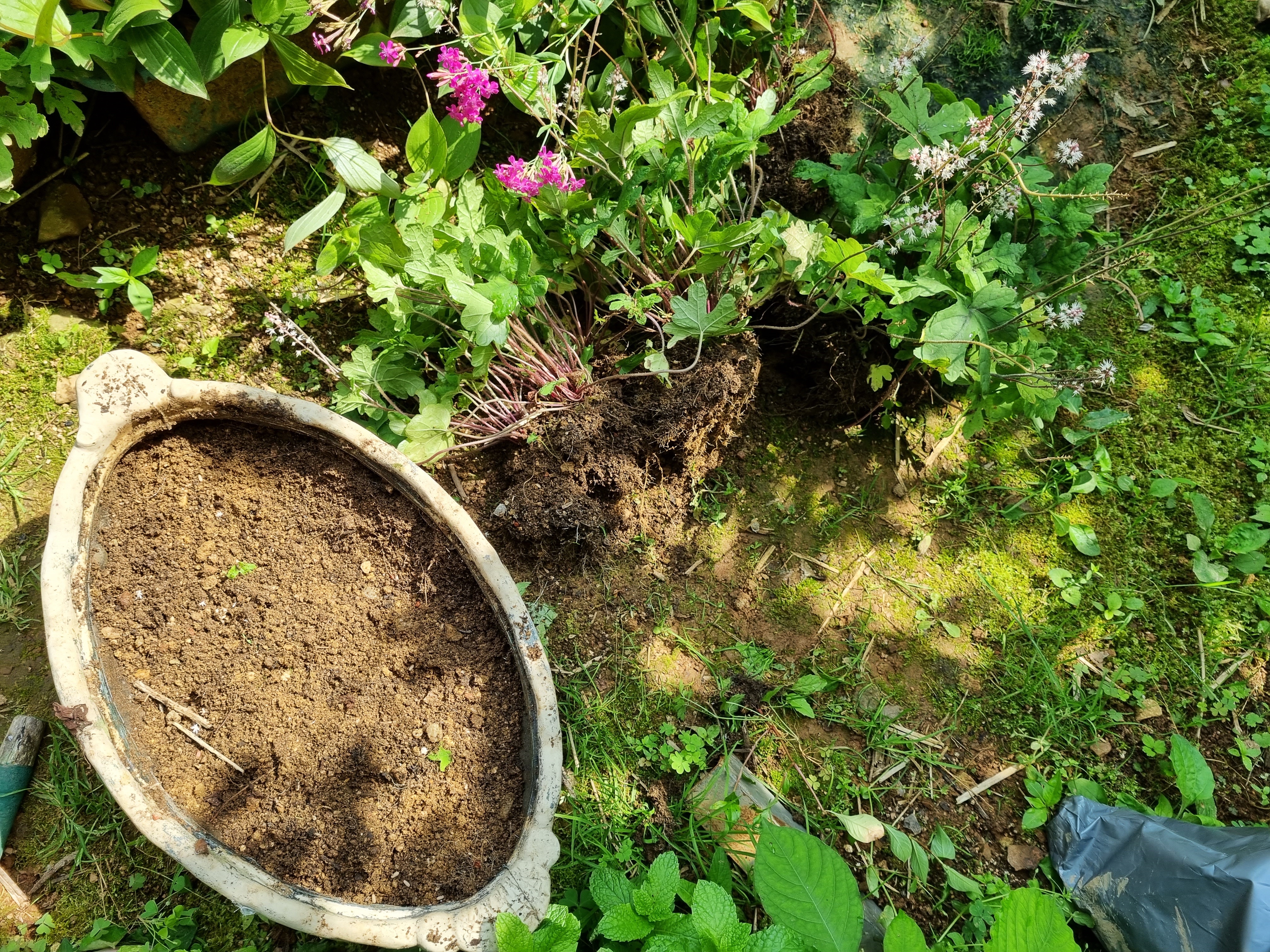 물을 자주 주어야 했던 화분으로 건조해도 좋은 매발톱을 심을 겁니다. 역시 화분의 흙과 상토와 지렁이 퇴비를 혼합하여 매발톱 두 포기를 나란히 심었습니다.