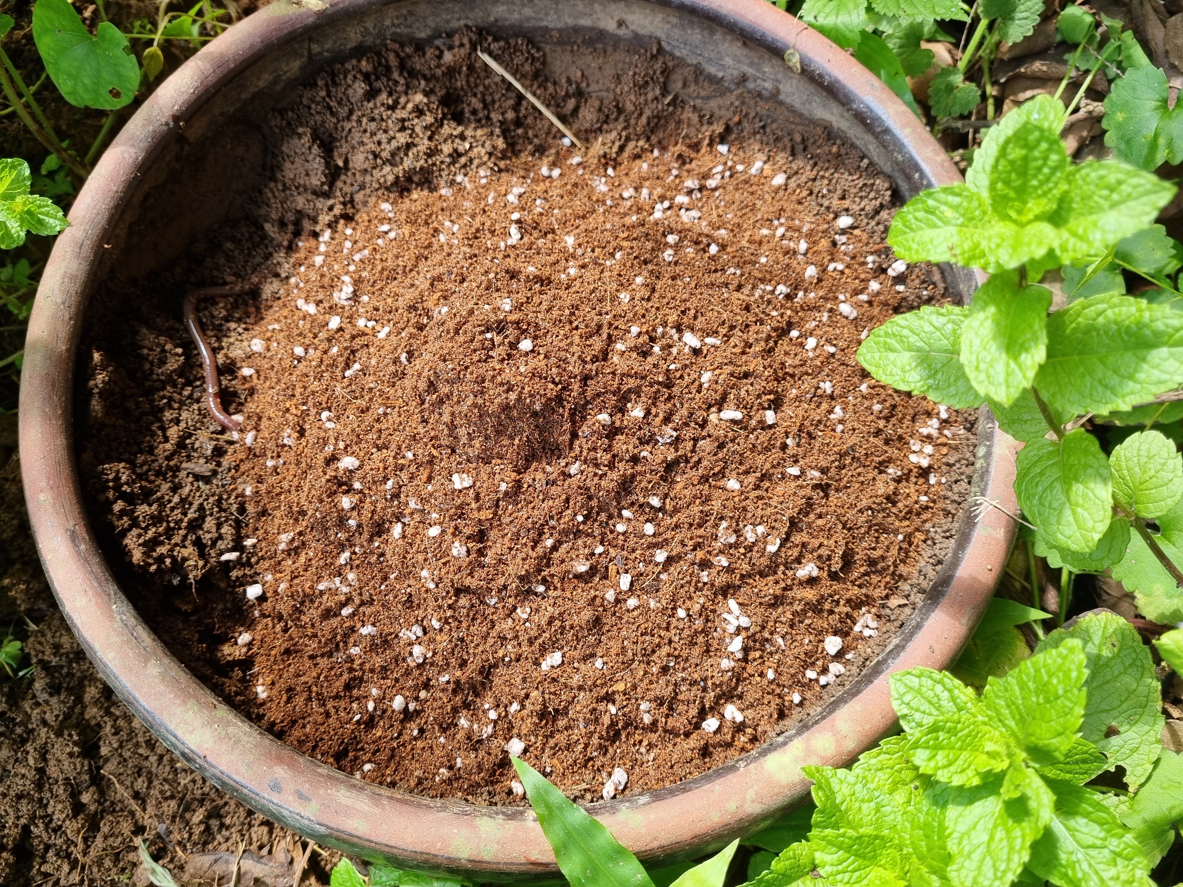 화분의 흙과 상토와 지렁이 퇴비를 혼합하여 매화헐떡이를 심었습니다.