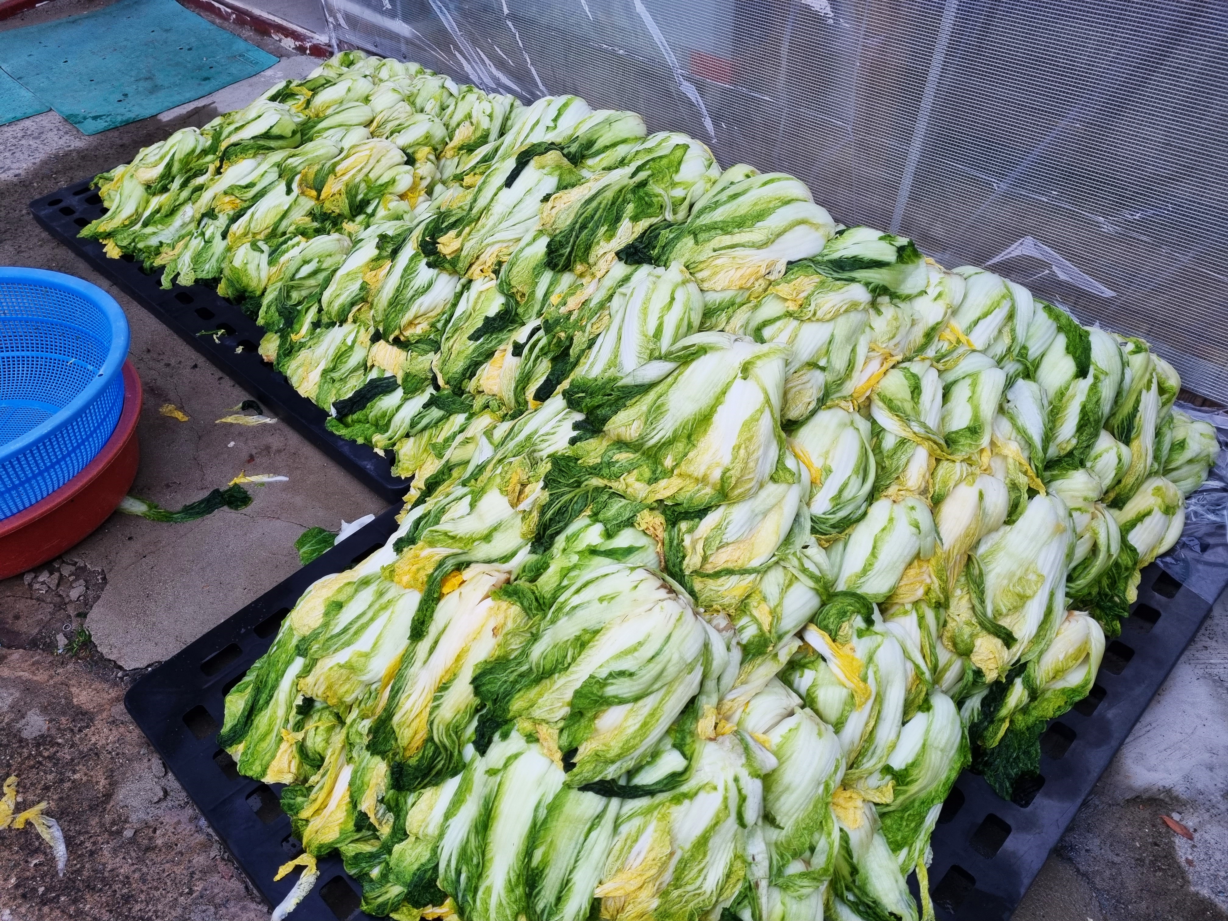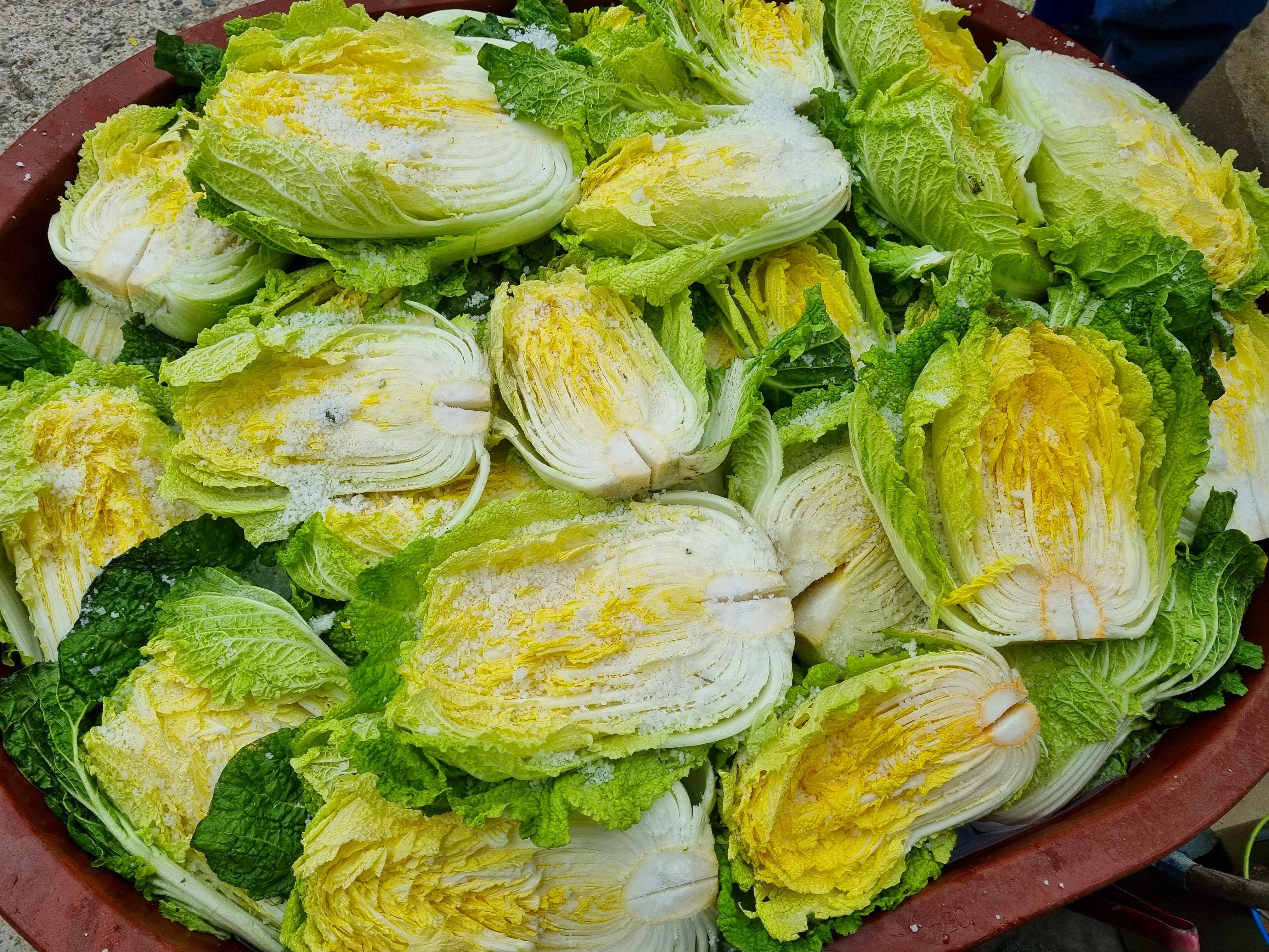 배추를 절이는 간은 횟집에서 얻은 암반수를 배추에 부은후 소금을 쳤는데 세시간후 뒤집으면서 소금을 조금 더 쳤습니다.