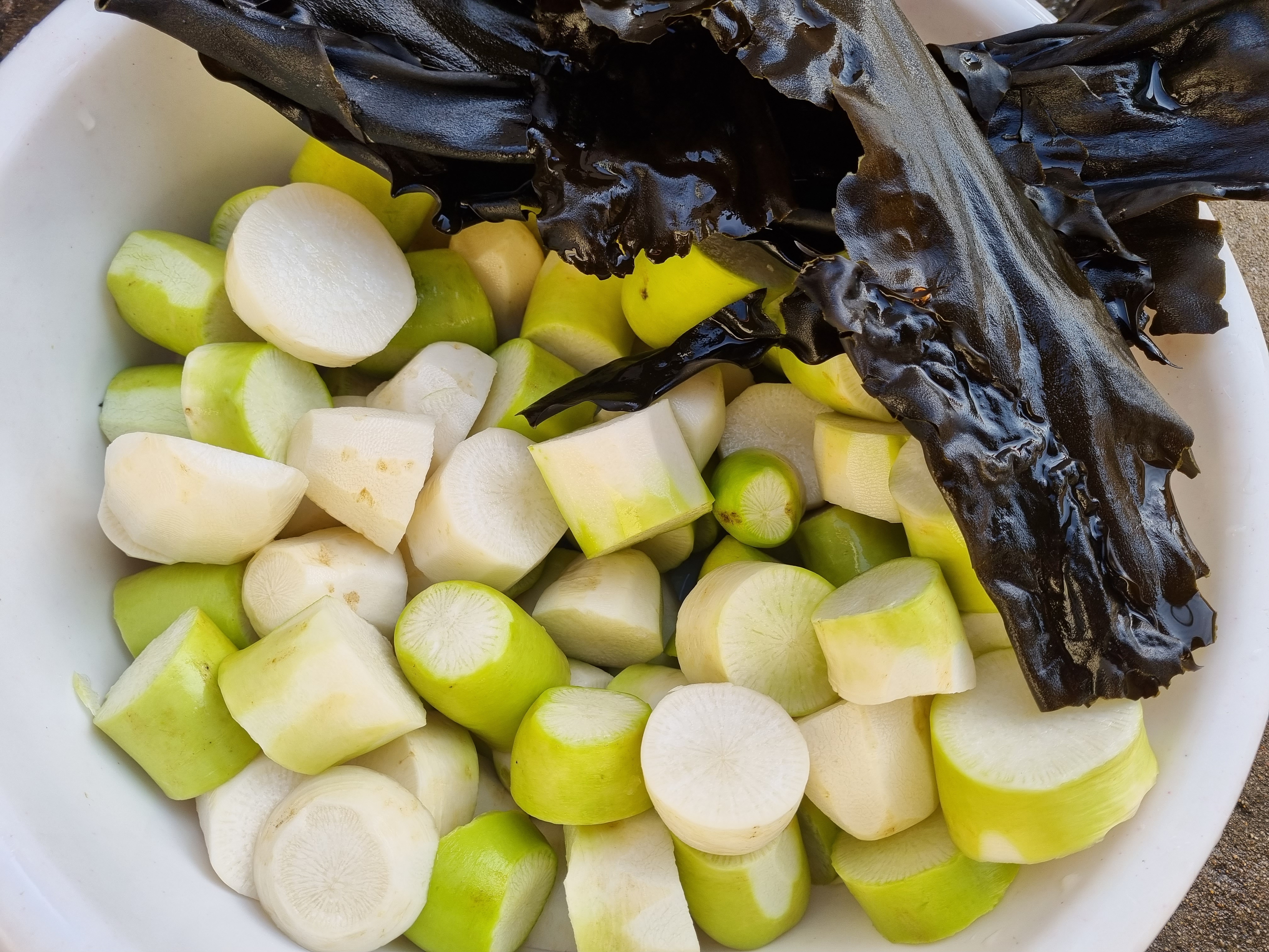맛국(다시)을 만들 재료입니다. 무와 다시마, 버섯, 양파, 멸치입니다. 무와 다시마를 제외한 나머지 재료는 헝겊주머니에 담았으며, 다시마는 다시물이 끓을 때 건져낼겁니다.