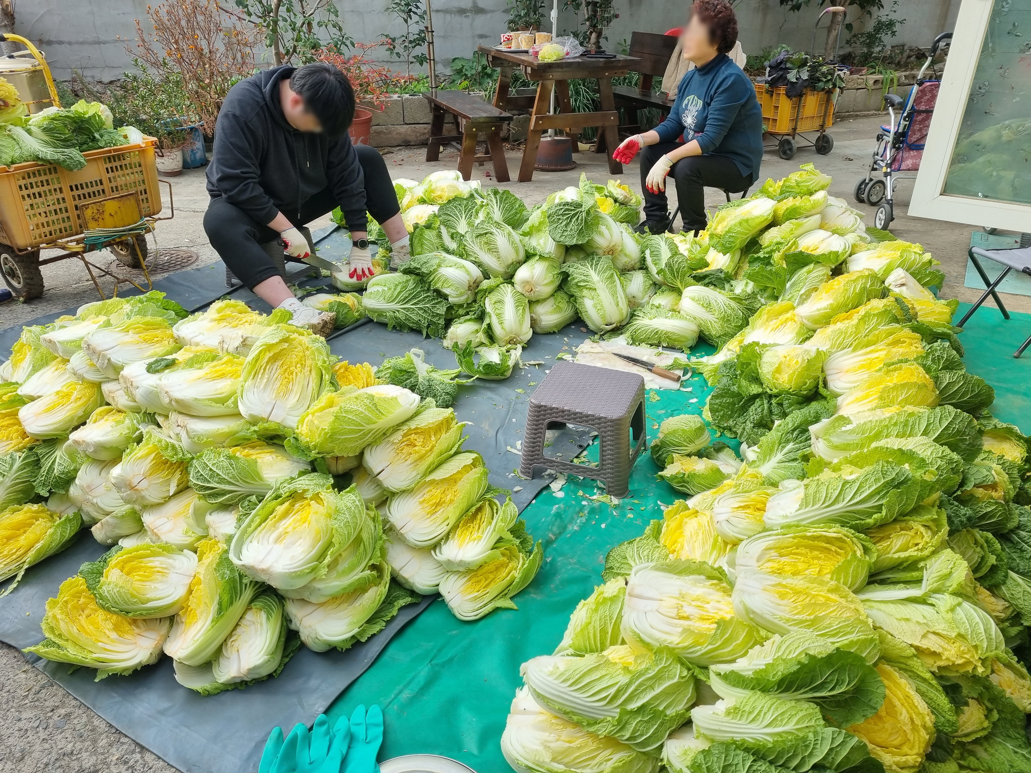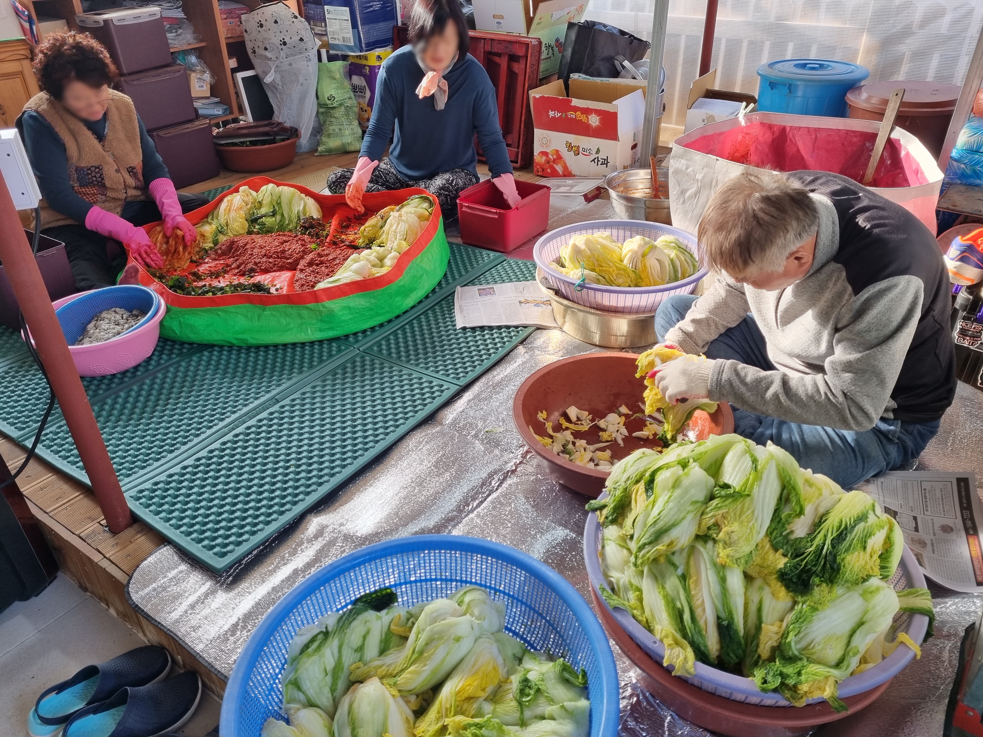 이참에 하우스 지붕을 다시 덮었다보니 바람 한점 들어오지 않는 하우스에서 양념을 치댔습니다. 올케와 시누이인데 각자의 김치통에 치댄 김장을 담았으며 우리 김장은 시누이와 함께 치대어 담았습니다.